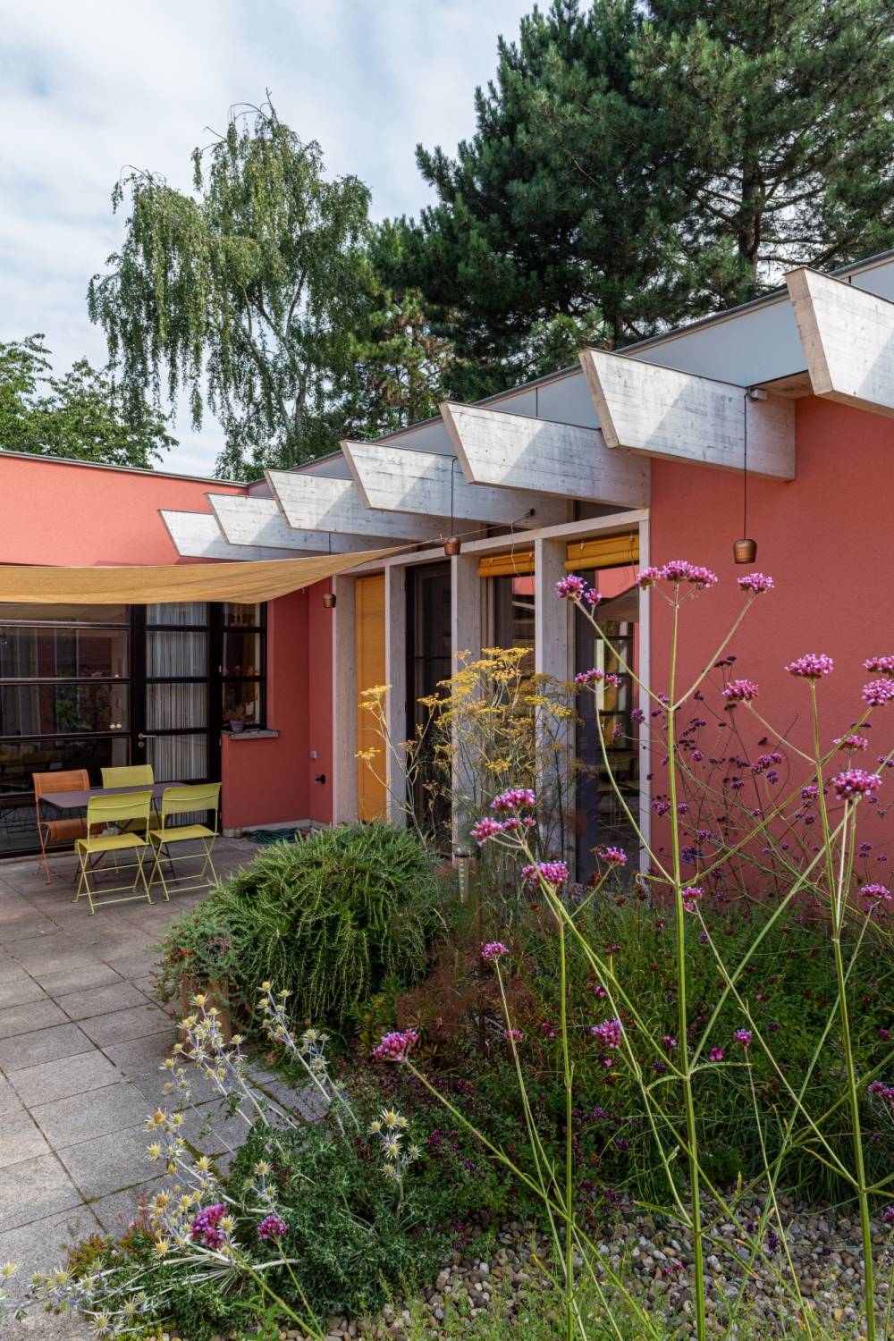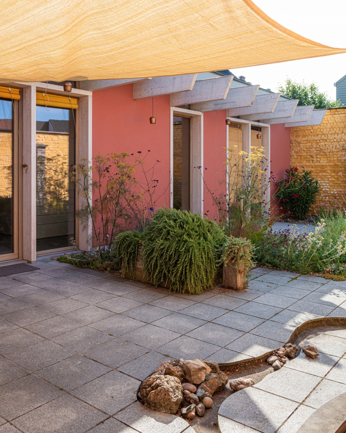 Het ontwerp gaat op zoek naar een concept dat licht, beleving, materialiteit en relaties in zijn eenvoud voorop stelt. De connectie vanuit de woning naar de patio wordt versterkt, terwijl de woning een eerder gesloten houding aanneemt richting oprit. Centraal in het ontwerp staan de patio en de muur uitgevoerd in stampleem, die de woning in een warme, huiselijke en groene sfeer omhullen.