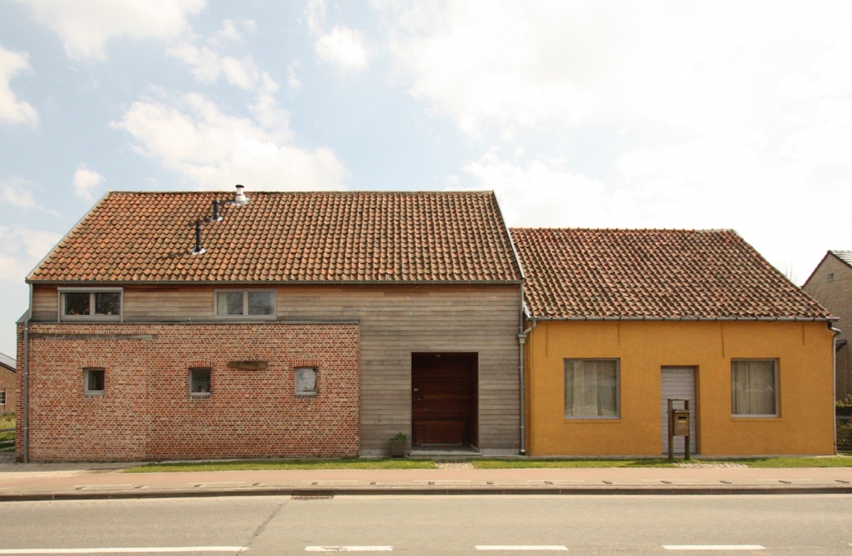 07.227 De oorspronkelijke toestand bestond uit een woning en een schuur die in één aansluitend volume waren gehuisvest. De beste optie om deze woning te renoveren, bestond erin om het bestaande woongedeelte te behouden. Zo konden de eigenaars er blijven wonen tijdens de verbouwing, en kon dit deel van de woning nadien dienst doen als “goedkope en degelijke” berging en hobbyruimtes. Indien we de woning hadden moeten aanpakken had dit veel inspanningen gekost op vlak van ruwbouw en oplossen van vochtige muren. Vervolgens werd de oude schuur open gemaakt aan de achterzijde en in de resterende muren in U-vorm werd een nieuwe woning geschoven in bio-ecologisch houtskeletbouw. De oude muren dienen dan enkel te functioneren als parement en niet langer als dragende schil. De woning is bovendien aan de zuidwest-zijde open getrokken met vide en patio zodat er licht tot diep in de woning kan vallen en er op terras kan gezeten worden uit de wind. Het is een vrij compacte woning met hoog comfort die, dankzij de vele handen van deze zelfbouwers en familie, resulteerde in een prachtig project.